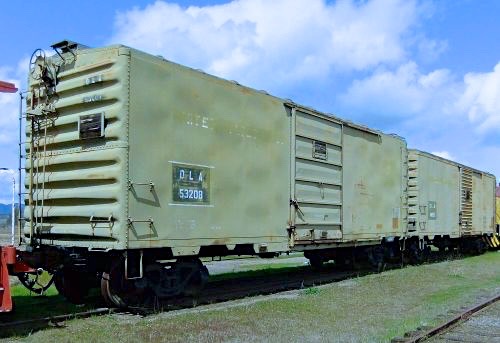 In 1997 our Society acquired three government surplus boxcars, stored at Ogden, Utah. They were trucked to Oregon, with the two pictured here delivered to the Society on an unused siding at Tolo. These are DLA (Defense Logistics Agency) #44015, an AAR design (manufacturer unknown) built in 1944, and DLA #53208, a Pullman-Standard PS-1 built in 1953. Both cars are in “like-new” condition, having seen very little use by the military. We are using those two cars to store additional diesel locomotive parts, as well as more of the Society's collection of railroad items.